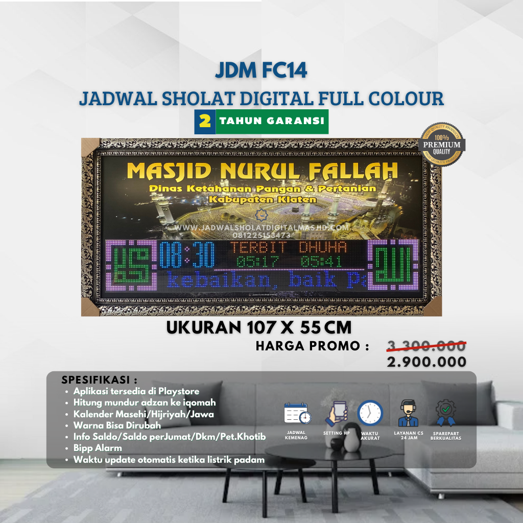 Inilah saatnya masjid Anda memiliki jam digital masjid dengan tampilan elegan dan Berkualitas. Menampilkan jadwal sholat otomatis, adzan, timer iqomah, dan berbagai fitur canggih lainnya.